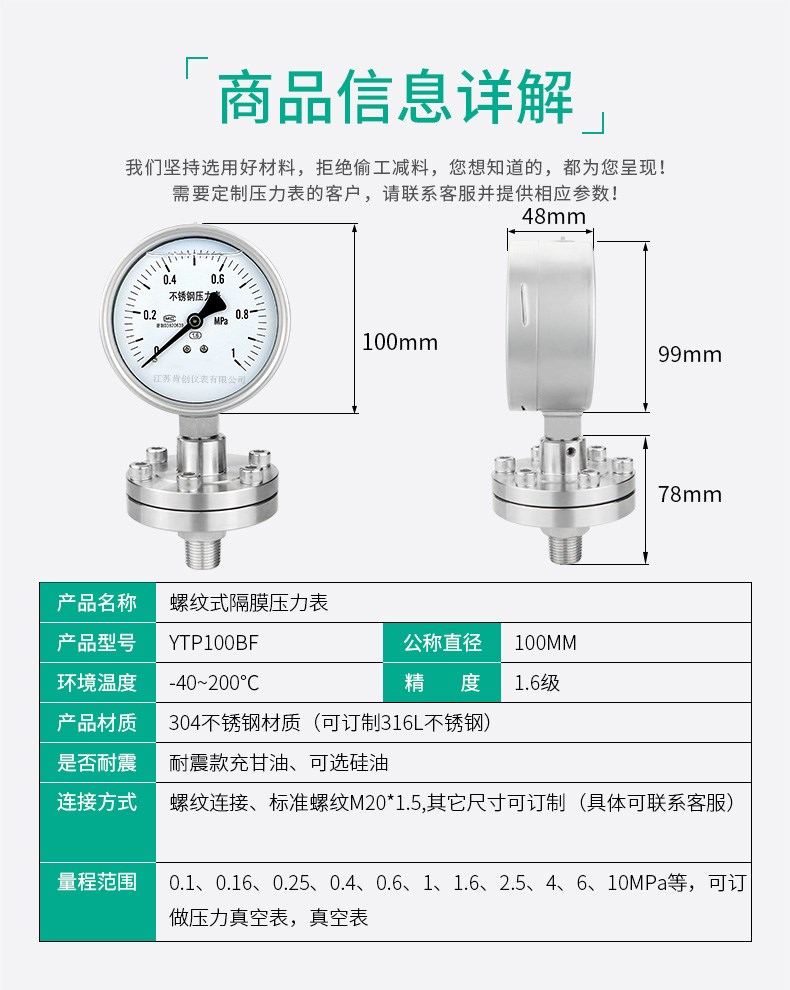 产品详情:压力表,不锈钢螺纹隔膜压力表,不锈钢螺纹隔膜压力表标准